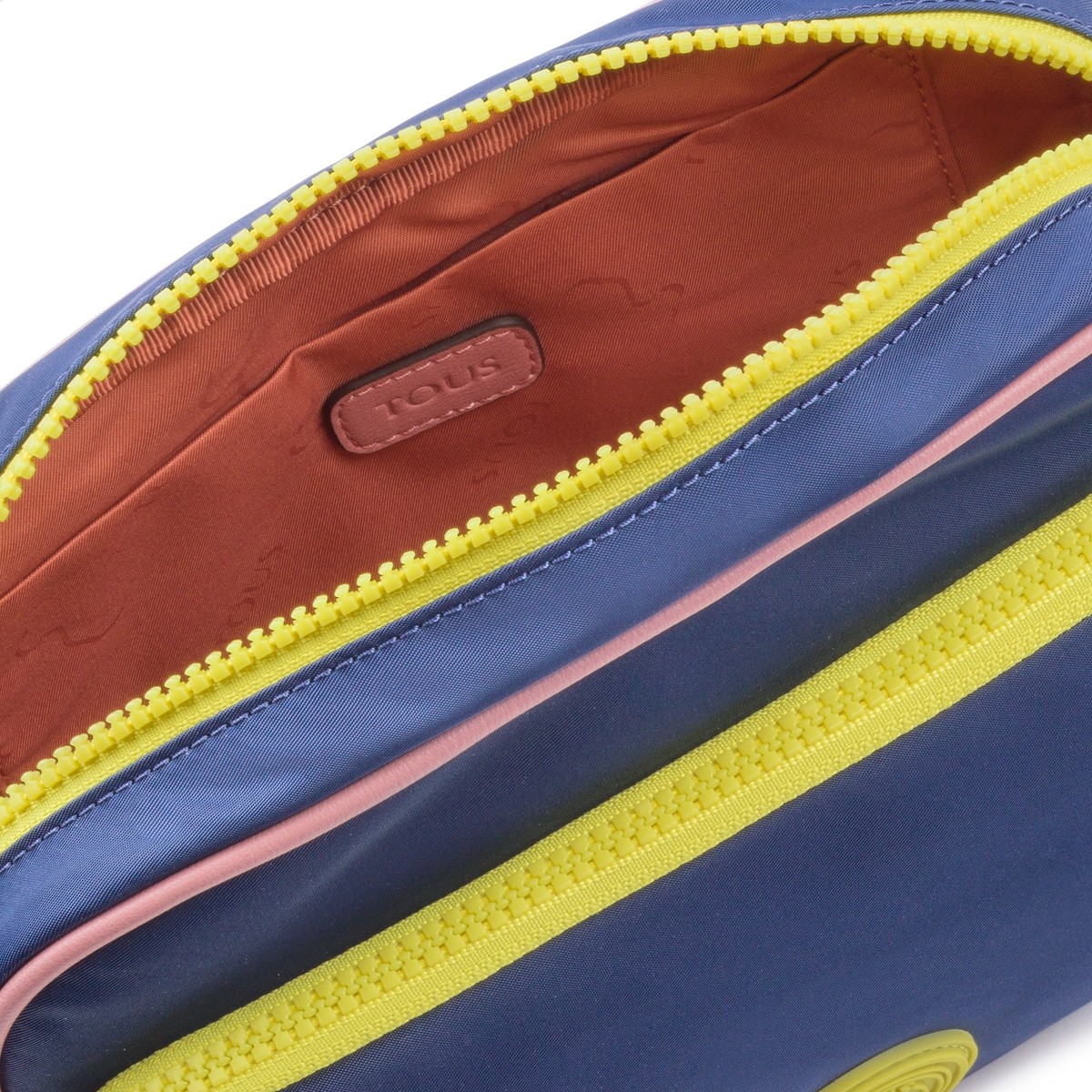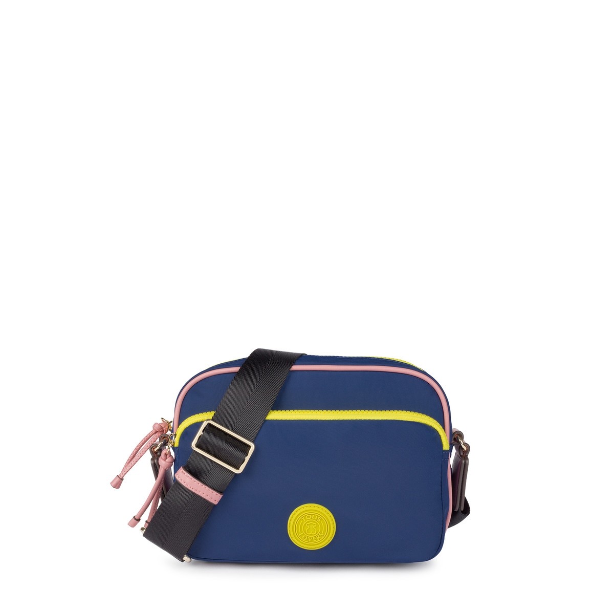Bolso bandolera TOUS colección New Doromy de nylon combinado con vinilo efecto piel en tri-marino y parche de goma. Cierre con cremallera. Apliques contrastados. Asa de bandolera ajustable. Un bolsillo interior plano. Un bolsillo exterior con cremallera. Medidas: 19x23x8,52 cm.
