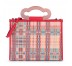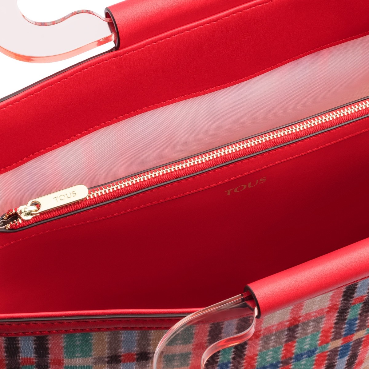 Bolso city mediano TOUS New Marlen de vinilo estampado Tartan Bears en color rojo combinado con azul, verde, amarillo, marrón, negro y blanco. Asas de mano en forma de nuestro oso y asa bandolera ajustable y extraíble. Cierre con cremallera. Medidas: 27,5x35x13 cm.
