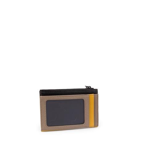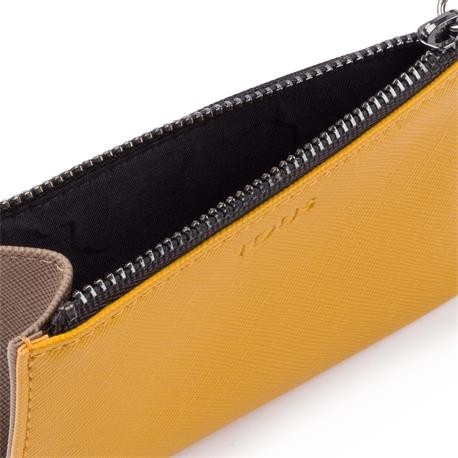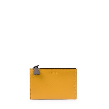 Monedero TOUS de la colección Carlata en color Mostaza y negro, fabricado con vinilo. Tiene cierre de cremallera dorado y posee un departamento exterior para tarjetas. Un monedero tan sencillo como prático y original.