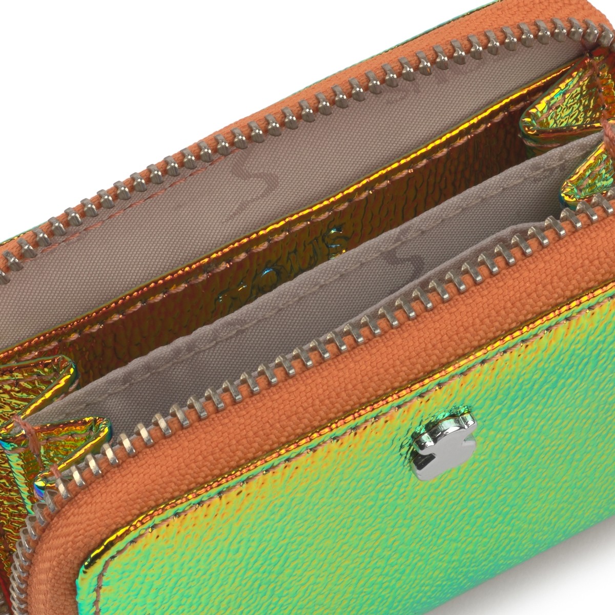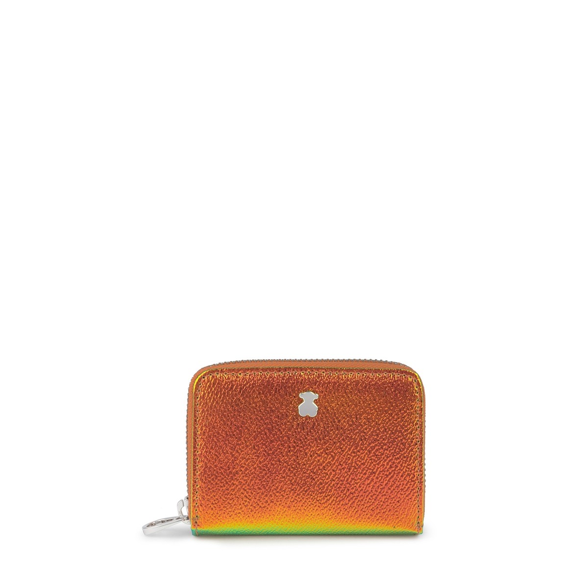 Monedero mediano TOUS colección Dorp de vinilo efecto piel con acabado charol en color Iriscente naranja. Cierre con cremallera. Apliques personalizados en tono plata. Tres compartimentos y dos bolsillos planos. Medidas: 8 x10x 2,5 cm.