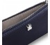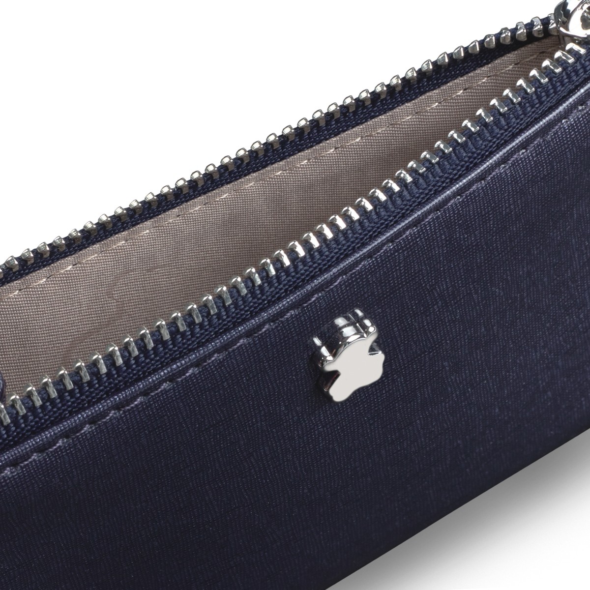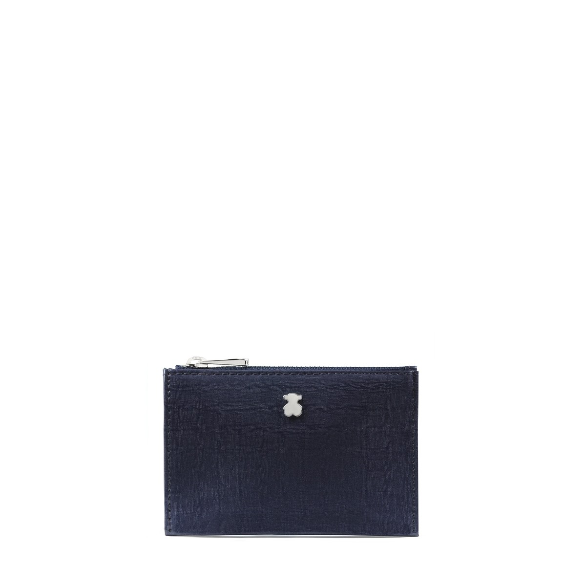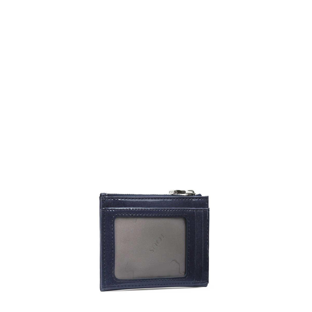 Monedero y tarjetero TOUS colección Dorp de vinilo efecto piel con acabado charol en color azul marino. Cierre con cremallera. Apliques personalizados en tono dorado pálido. Tres compartimentos exteriores para tarjetas. Medidas: 8x12x1 cm.