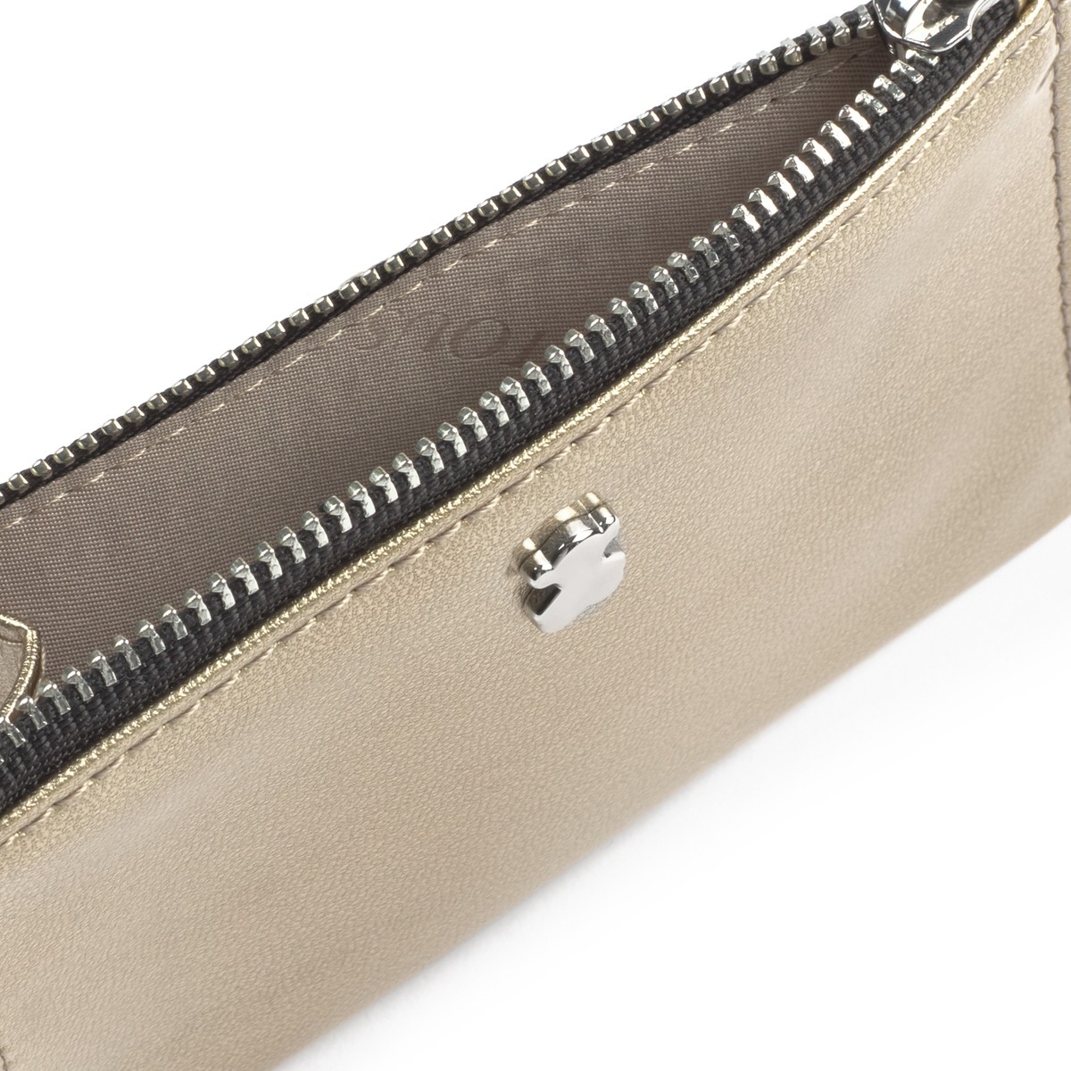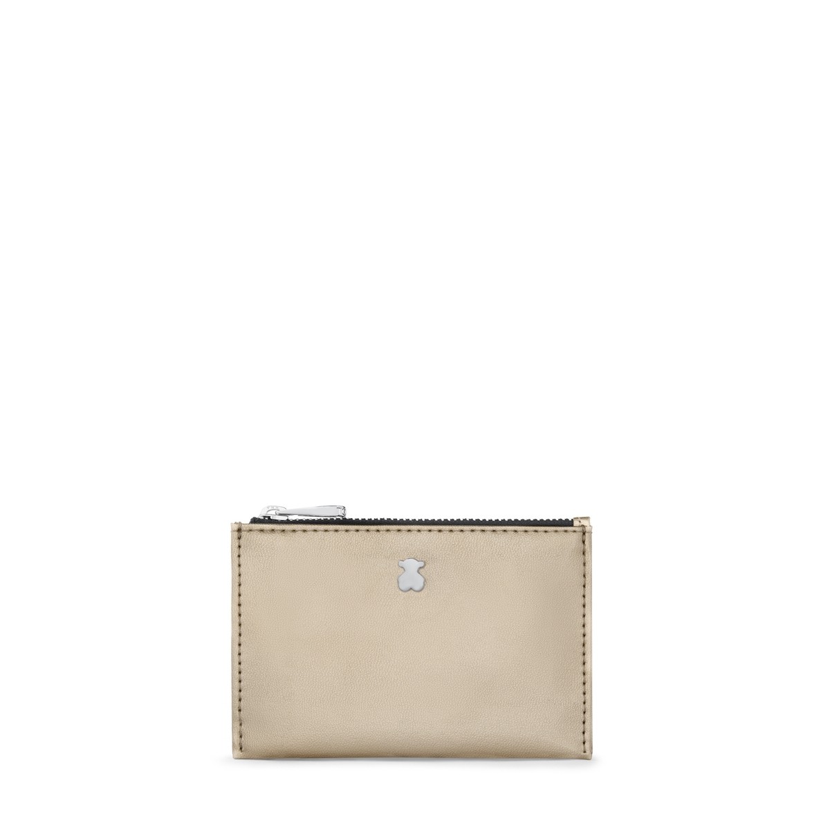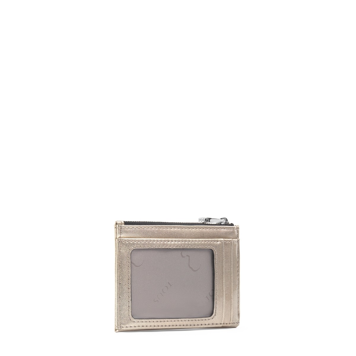 Monedero y tarjetero TOUS colección Dorp de vinilo efecto piel con acabado charol en color dorado. Cierre con cremallera. Apliques personalizados en tono dorado pálido. Tres compartimentos exteriores para tarjetas. Medidas: 8x12x1 cm.