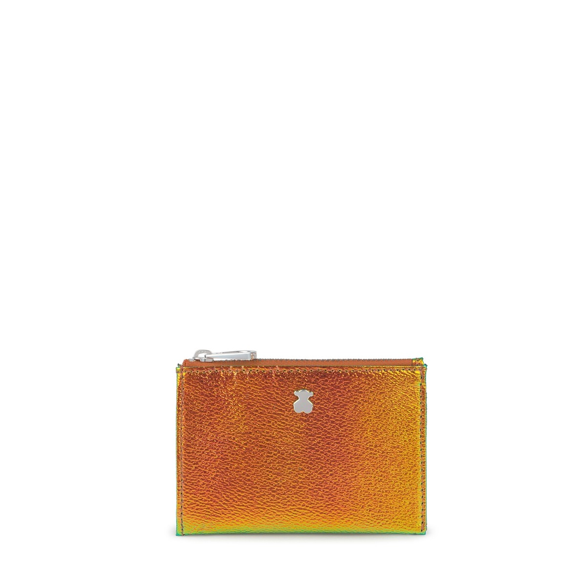 Monedero y tarjetero TOUS colección Dorp de vinilo efecto piel con acabado charol en color iriscente naranja. Cierre con cremallera. Apliques personalizados en tono dorado pálido. Tres compartimentos exteriores para tarjetas. Medidas: 8x12x1 cm.