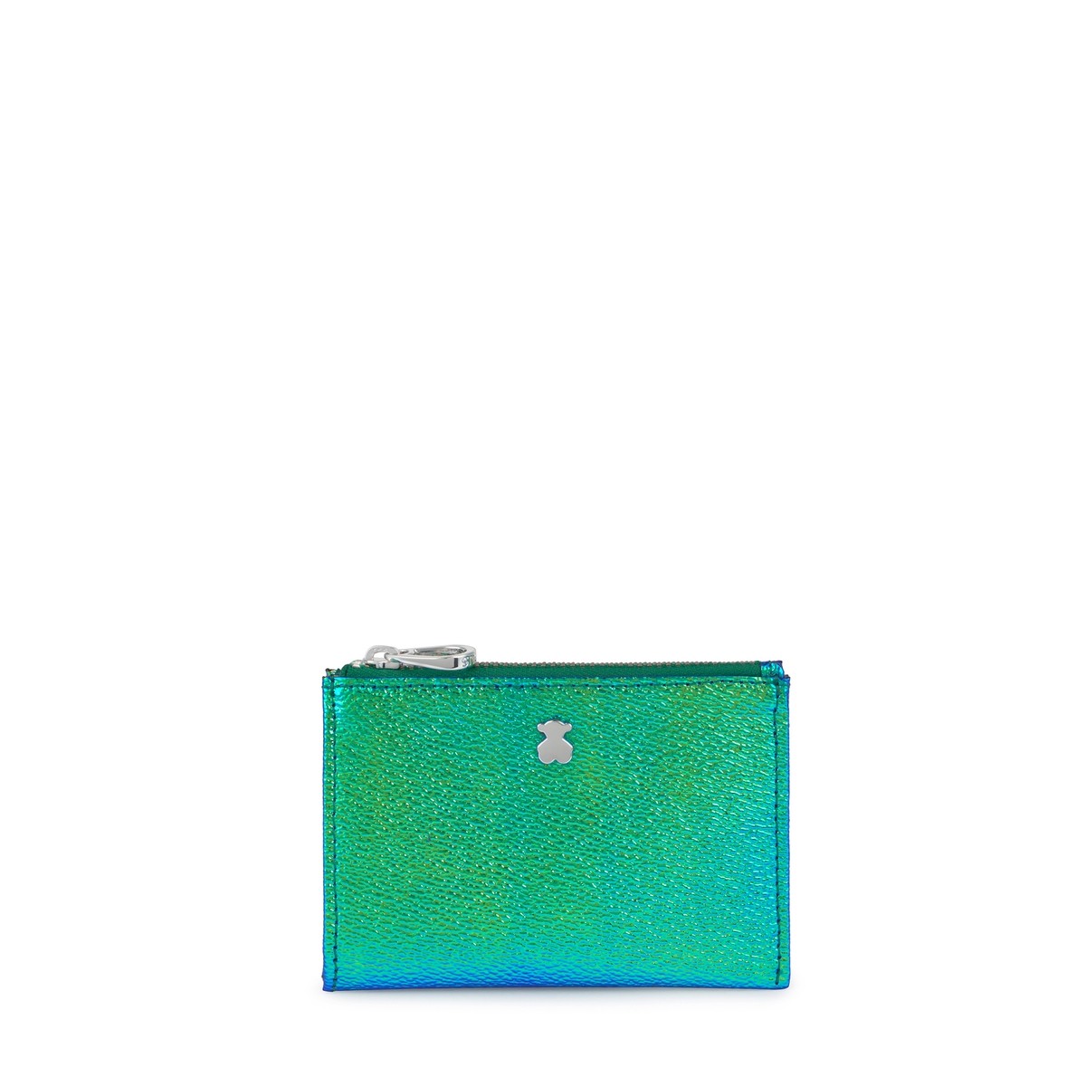 Monedero y tarjetero TOUS colección Dorp de vinilo efecto piel con acabado charol en color iriscente verde. Cierre con cremallera. Apliques personalizados en tono dorado pálido. Tres compartimentos exteriores para tarjetas. Medidas: 8x12x1 cm.