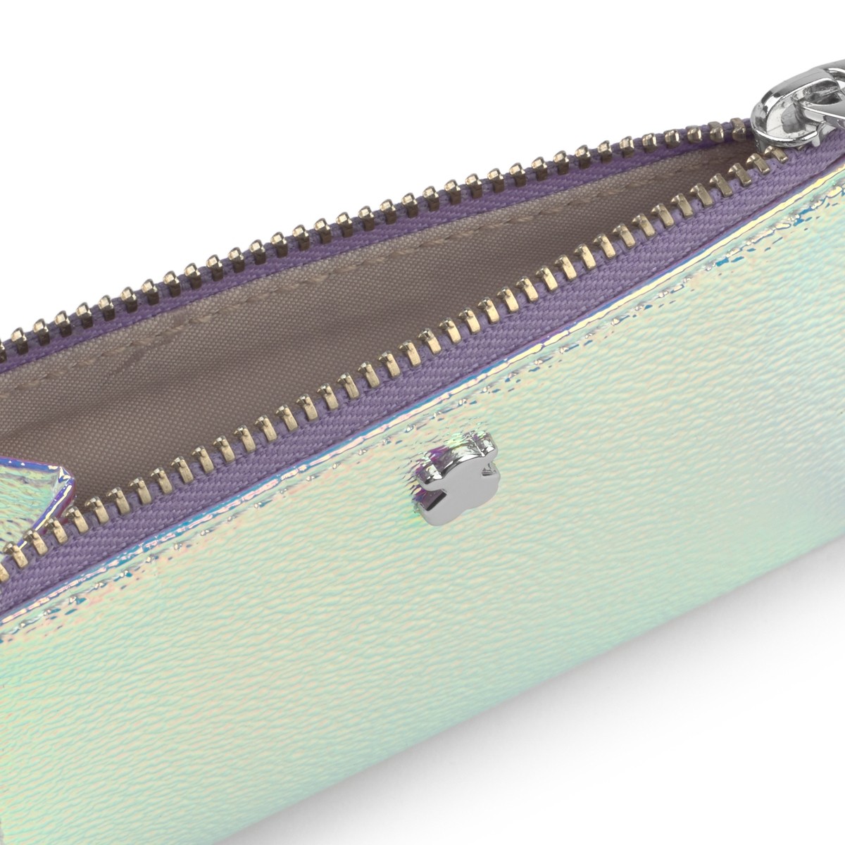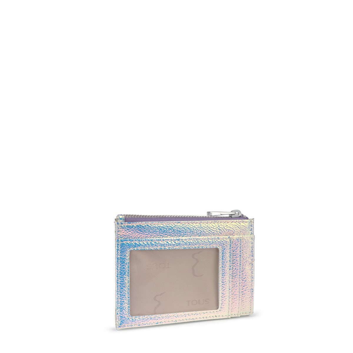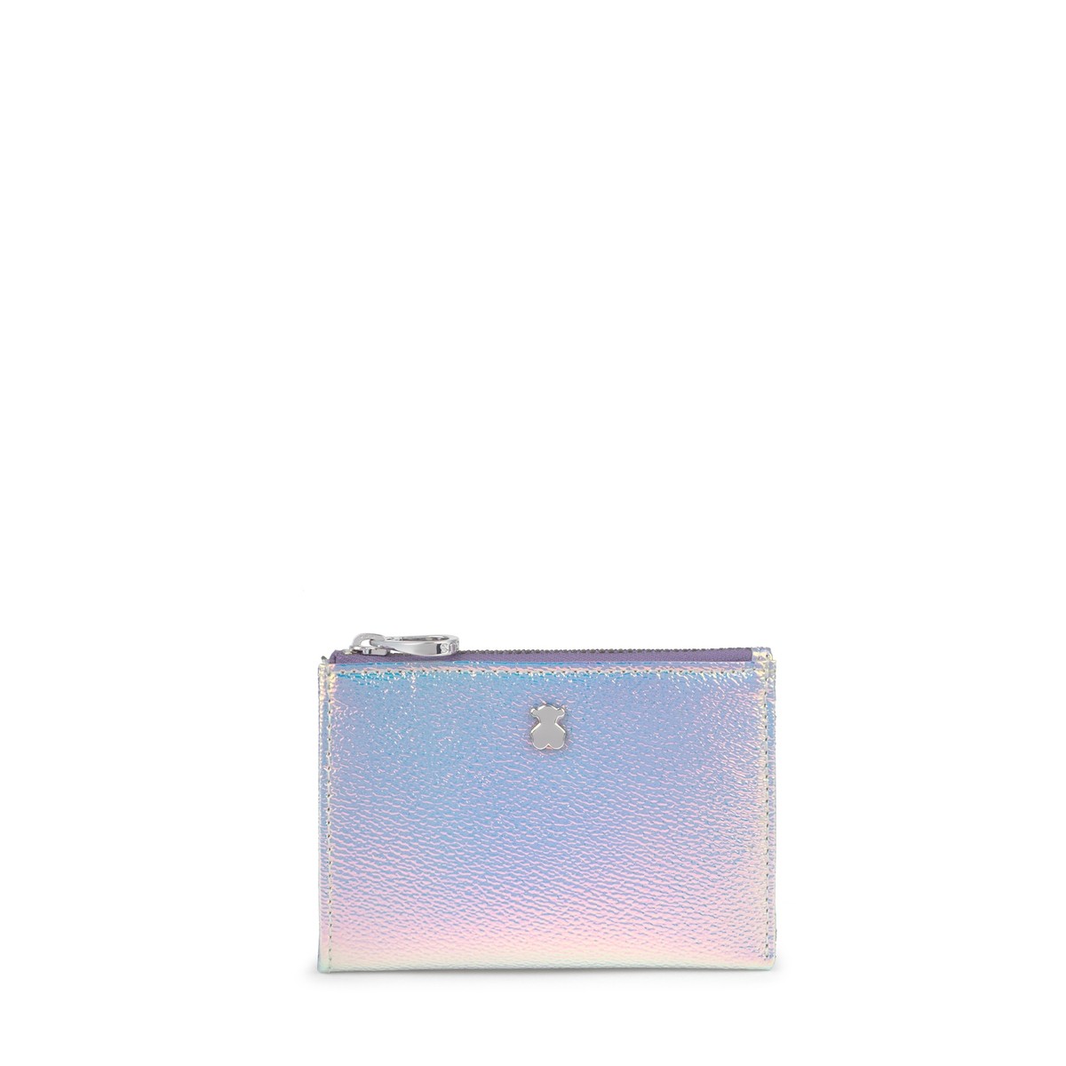 Monedero y tarjetero TOUS colección Dorp de vinilo efecto piel con acabado charol en color iriscente lila. Cierre con cremallera. Apliques personalizados en tono dorado pálido. Tres compartimentos exteriores para tarjetas. Medidas: 8x12x1 cm.