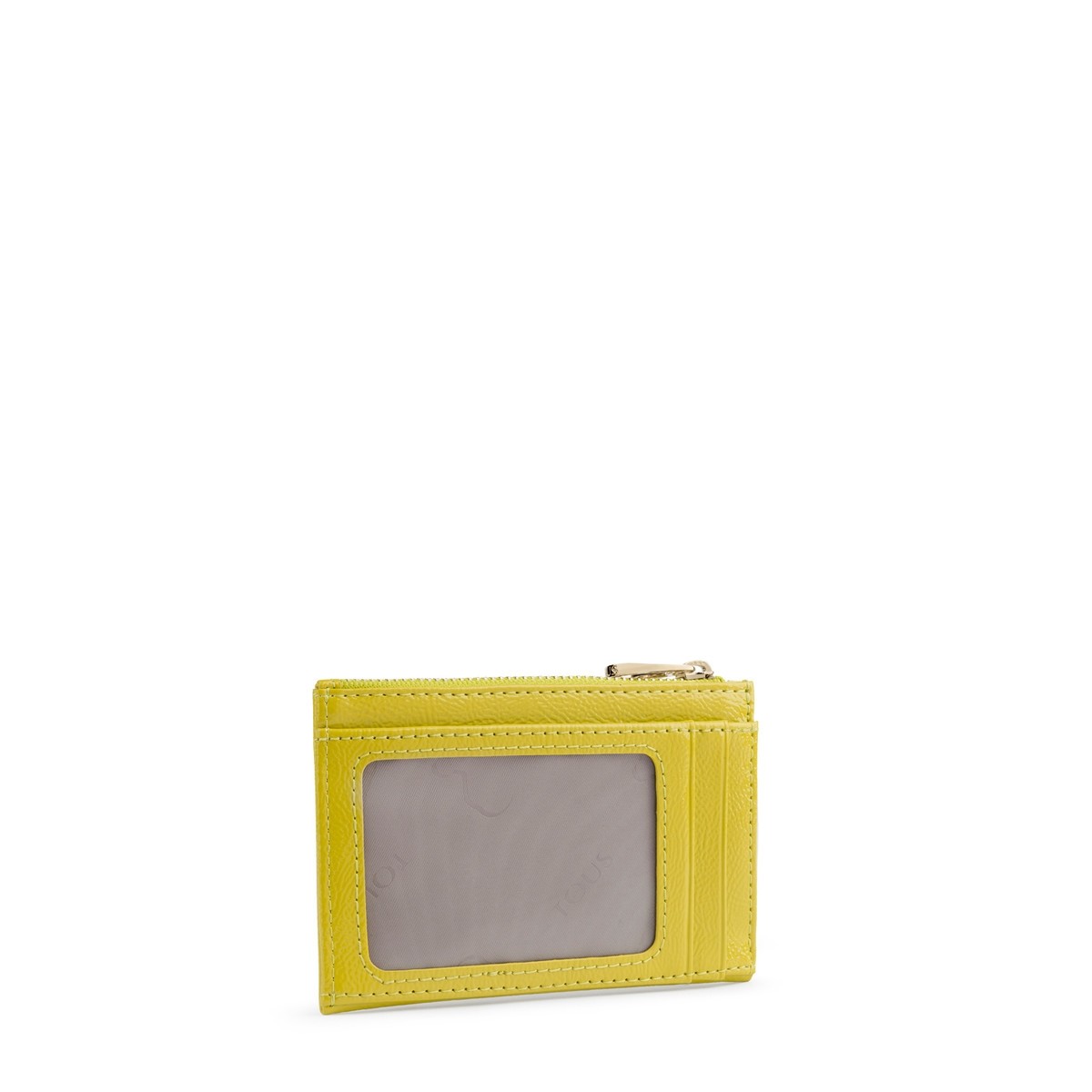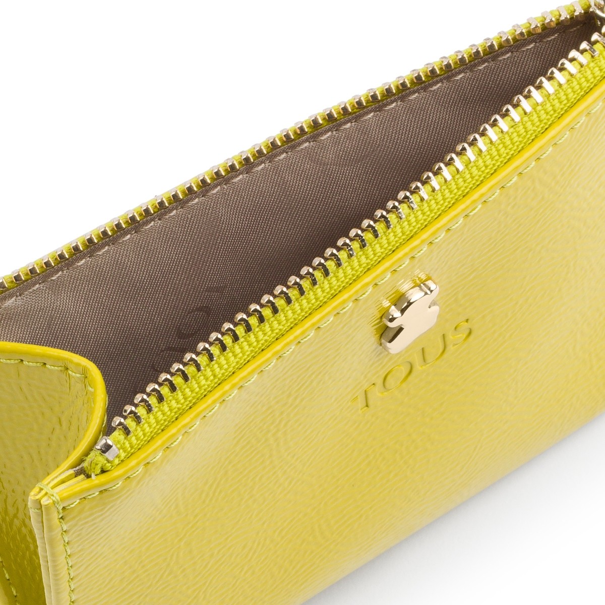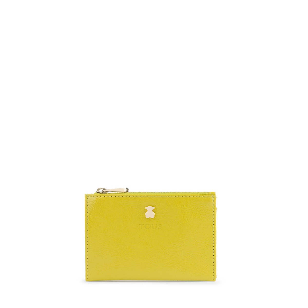 Monedero y tarjetero TOUS colección Dorp de vinilo efecto piel con acabado charol en color pistacho. Cierre con cremallera. Apliques personalizados en tono dorado pálido. Tres compartimentos exteriores para tarjetas. Medidas: 8x12x1 cm.