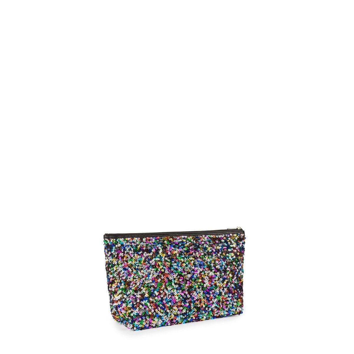 Bolsa pequeña TOUS colección Kaos Shock Sequins de lentejuelas multicolor. Cierre con cremallera. Apliques personalizados en tono dorado pálido. Botones a presión en los laterales para incorporar dentro de un capazo pequeño Kaos Shock. Medidas: 20x26x14 cm.