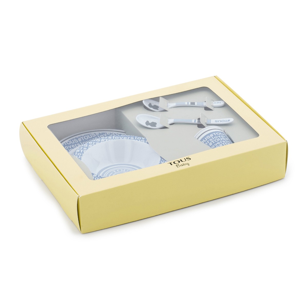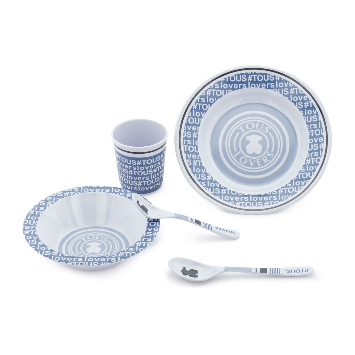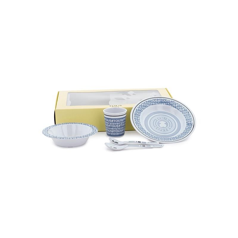 Vajilla para bebé de TOUS en color azul celeste compuesta por 5 piezas, bol, plato llano, vaso y cubiertos. Perfecta para que el bebé desarrolle su aprendizaje con los utensilios a la hora de comer. Recomendado para mayores de 6 meses.